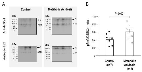 Figure 9. The influence of 24 h metabolic acidosis on the pSer982 status of renal NBCe1 protein. (A) Western blots showing anti-NBCe1 and anti-pSer982 immunoreactivity (dimer (d), and monomer (m)) in mice that had ad libitum access to drinking water containing 0.5% sucrose (control) or 0.5% sucrose plus 0.28 M NH4Cl (metabolic acidosis); (B) Quantification of the ratio of pSer982/NBCe1 in control versus metabolic acidotic mice. Equal protein loading and transfer among blots was confirmed using MemCode reversible (total) protein stain (see Supplemental Figure S3).