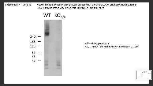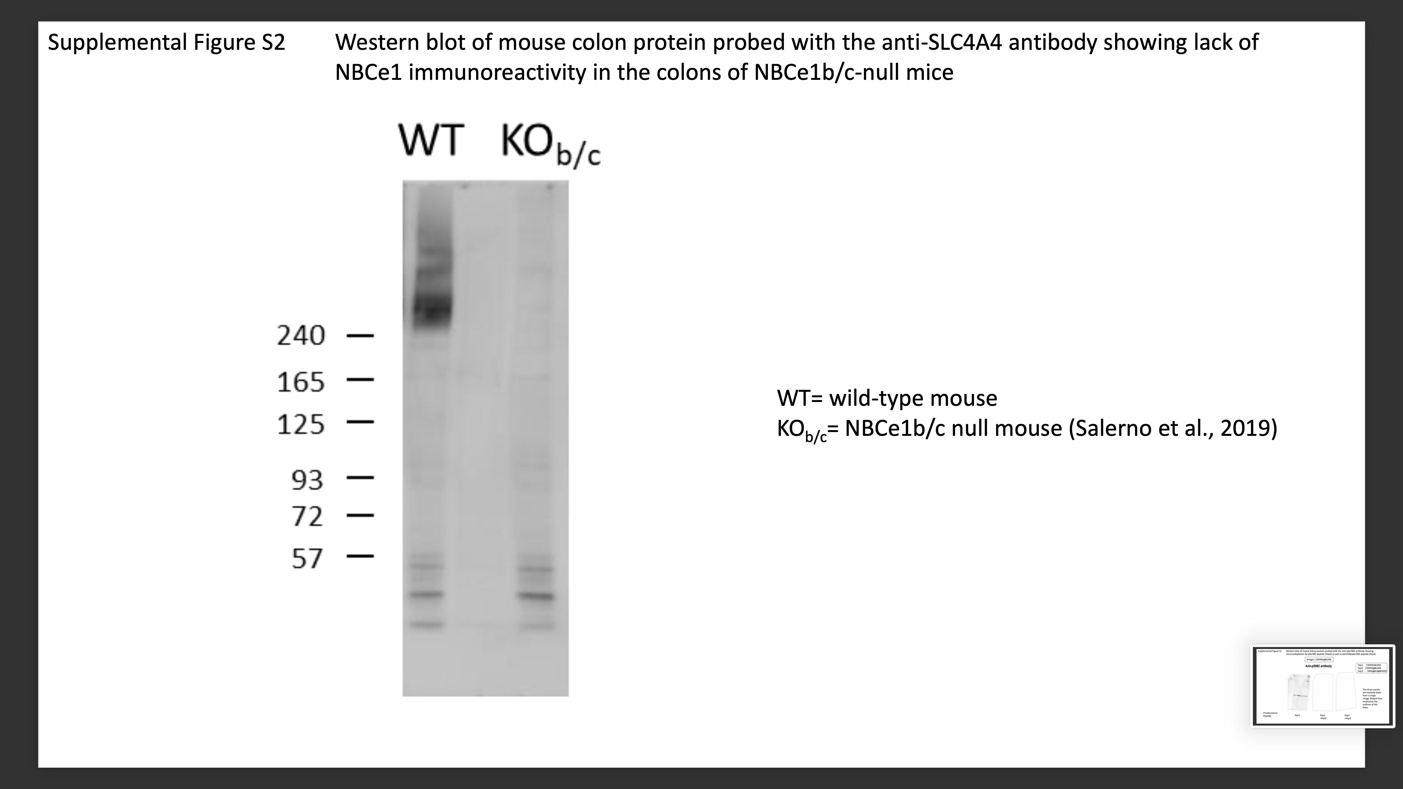 Supplemental Figure S2 Western blot of mouse colon protein probed with the anti-SLC4A4 antibody showing lack of NBCe1 immunoreactivity in the colons of NBCe1b/c-null mice