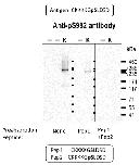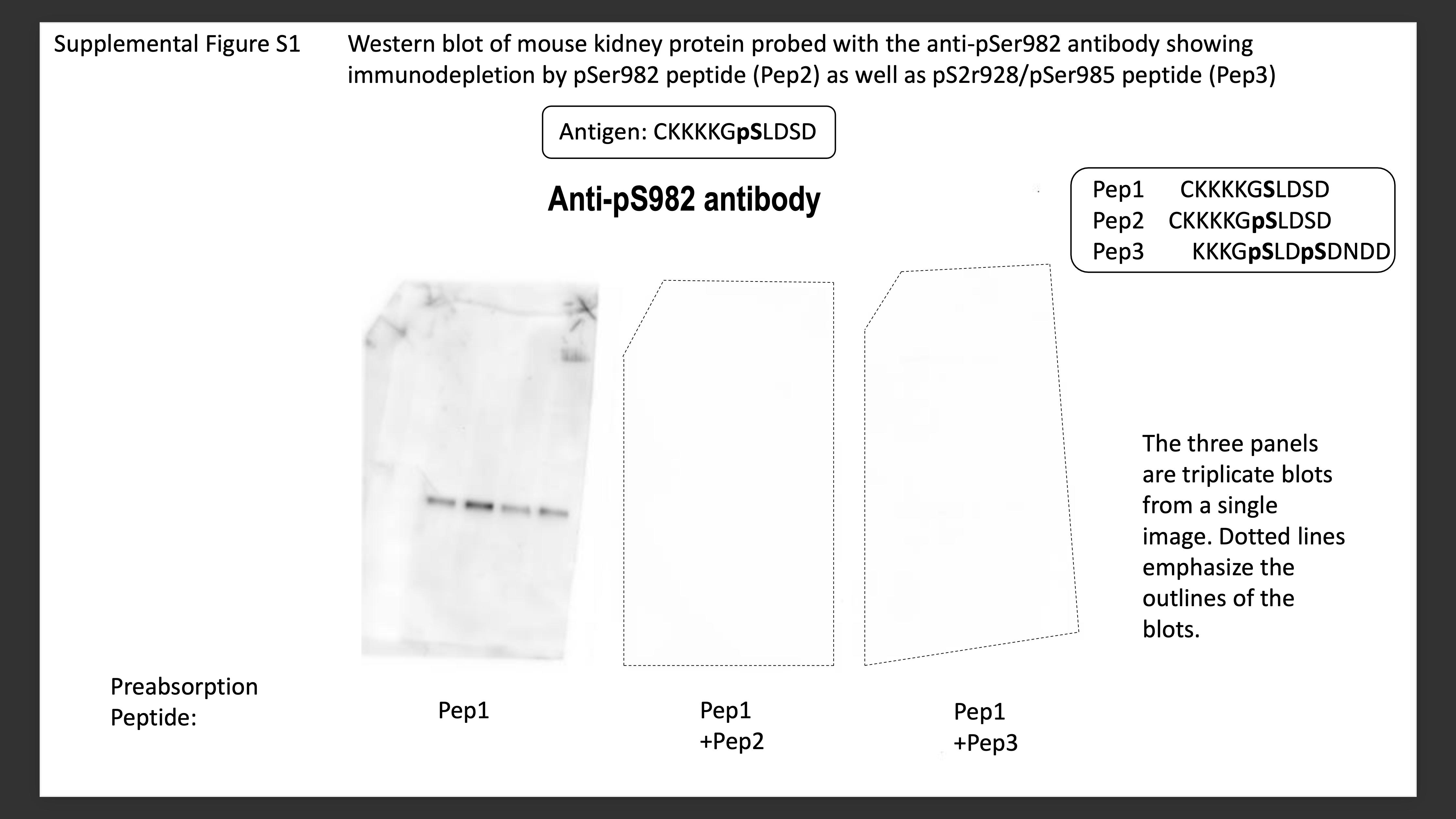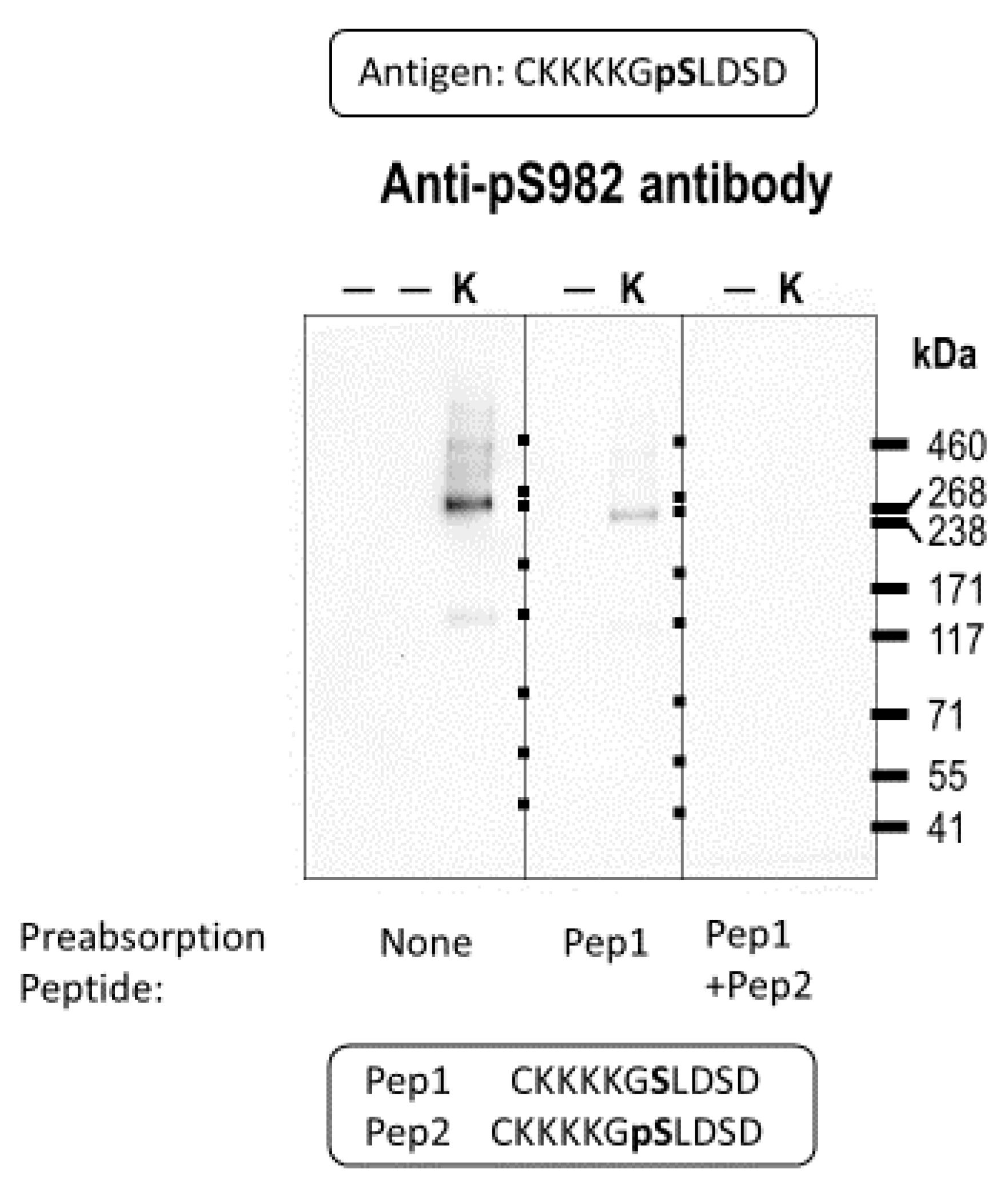Figure 2. Validation of the pSer982 antibody. Western blot showing anti-pS982 immunoreactivity in murine kidney protein lysates (K = kidney lysate containing lane; — = blank lane). For the middle and right blots, the antibody was preabsorbed with peptides representing the non-phosphorylated version of the epitope (Pep1) with and without a peptide representing the phosphorylated epitope (Pep2).