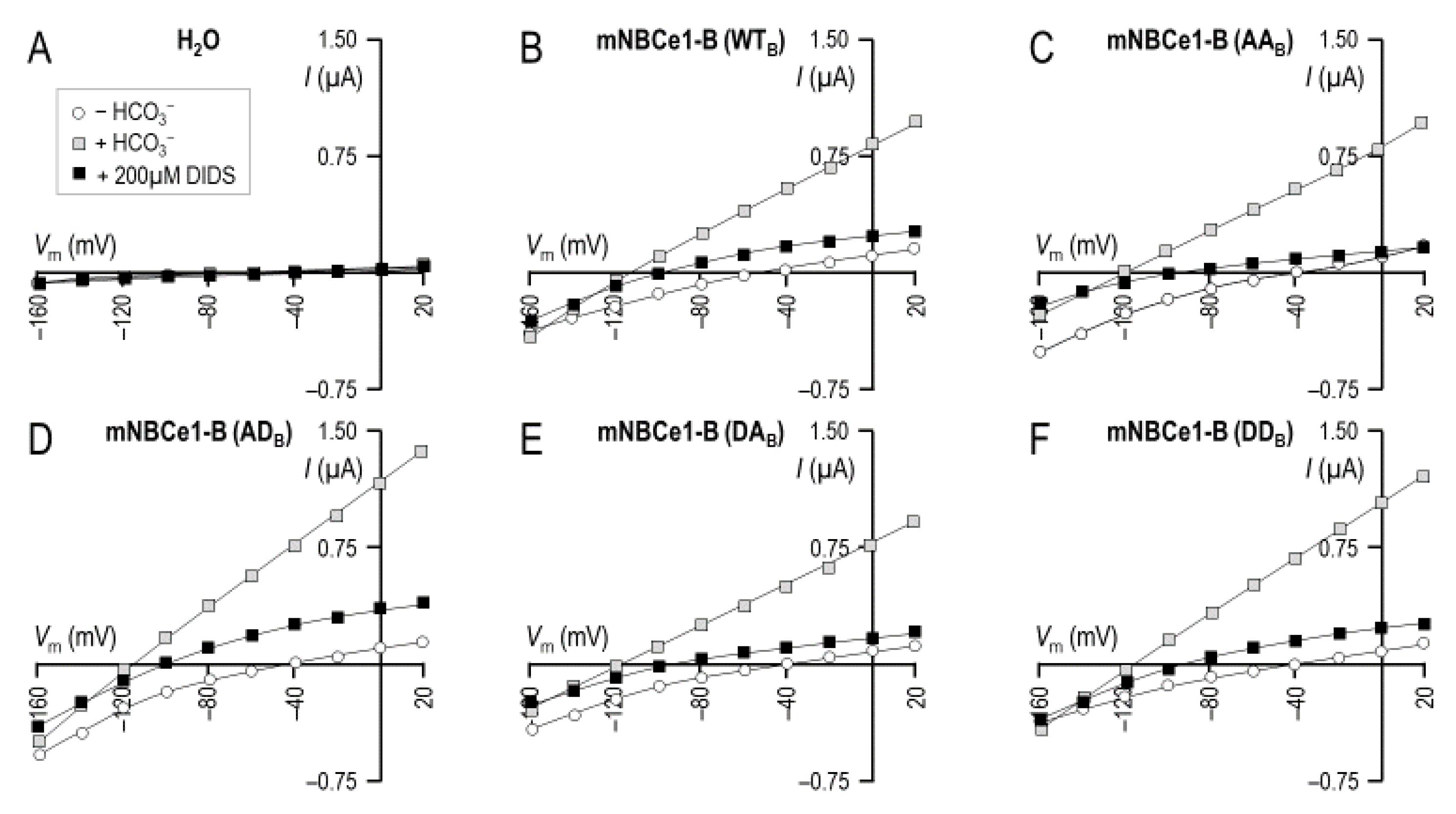 Figure 7. I–V relationships for oocyte expressing (de)phosphomimetic NBCe1-B clones. Each panel shows data gathered from a single representative oocyte injected with either (A) H2O, (B) cRNA-encoded wild-type NBCe1-B-EGFP, or (C–F) one of five cRNA-encoded (de)phosphomimetic mutants. Open circles are I–V data gathered from oocytes during perfusion with our CO2/HCO3−-free solution, gray squares are I–V data gathered during perfusion with our CO2/HCO3−-containing solution, and black squares are I–V data gathered during perfusion with our CO2/HCO3−-containing solution plus 200 µM DIDS.