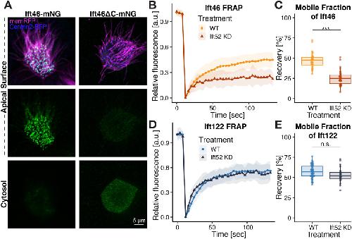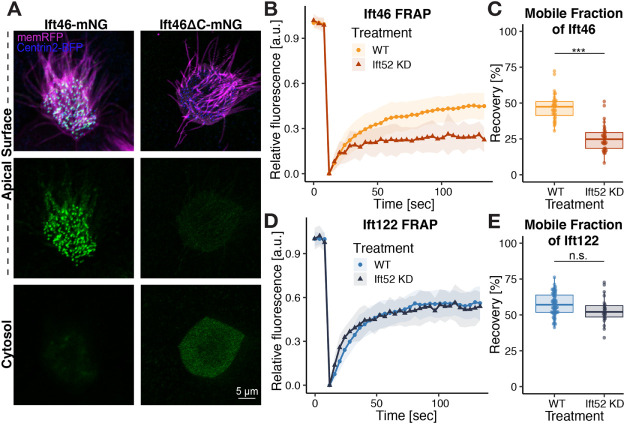 FIGURE 2: Ift52 is required for the recruitment and normal turnover of Ift46 at basal bodies. (A) Imaging of Ift46-mNG (left panel) and Ift46ΔC-mNG (right panel). (B) FRAP of Ift46-mNG in WT embryos compared with ift52 KD. (C) The mobile fraction value of Ift46-mNG is significantly lower on KD of Ift52. (D) FRAP recovery of GFP-Ift122, an IFT-A protein, is not affected by ift52 KD. (E) Mobile fraction quantification of GFP-Ift122 in WT and ift52 KD embryos. |