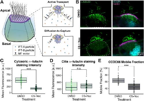 FIGURE 4: Cold-shock + nocodazole (CS + Noc) treatment eliminates cytosolic MTs and disrupts the dynamics of Ccdc66 at basal bodies. (A) Schematic representation of MCC depicting the two proposed mechanisms for IFT recruitment to basal bodies: active transport (top panel) and diffusion-to-capture (bottom panel). (B) Transverse sections of Xenopus MCCs stained for a-tubulin to verify efficacy of treatment. Actin (stained by Alexa Fluor 555 Phalloidin) and DAPI show the apical domain and nuclei, respectively. DMSO (mock)-treated cells are shown in the top panels and CS+Noc-treated cells in the bottom panels. (C) Cytosolic a-tubulin staining quantification for DMSO vs. CS+Noc-treated embryos. (D) Ciliary a-tubulin staining quantification for DMSO vs. CS+Noc-treated embryos. (E) Mobile fraction comparison of basal body turnover kinetics of Ccdc66 between DMSO and CS+Noc treatment. |