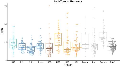Supplemental Figure 1. Half-times of basal body proteins are generally short. IFT and other basal body proteins generally display half-times less than 25 seconds. |