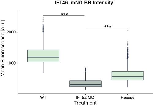 Supplemental Figure 2. Morpholino-based KD of ift52 is rescued by addition of Ift52. Basal body intensity of Ift46-mNG was measured in WT conditions and upon ift52 KD and ift52 KD + rescue. |