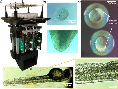 Fig. 1. Development of a low-cost system for simultaneous longitudinal biological imaging.a The Picroscope fits a standard 24-well plate, it is controlled remotely and images can be accessed through a web browser. b–d Applications of the Picroscope to longitudinal imaging of developmental biology and regeneration. b Regeneration of planaria worms Dugesia tigrina. c Zebrafish embryonic development at oblong stage. d Zebrafish embryo at 48 hours post fertilization. In complement see Supplementary Video 1. |