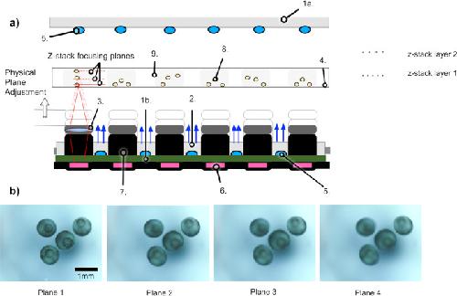 Fig. 4. Schematic representation of the z-stack function.a A single row of cameras demonstrating the z-stack function. 1.a = Over-the-plate illumination board, 1.b = Under-the-plate illumination board, 2 = Acrylic Light Diffuser, 3 = Lenses, 4 = Cell Culture Plate, 5 = LEDs, 6 = Raspberry Spy Cameras, 7 = 3D Printed Camera Bodies, 8 = Biological Sample (e.g., Frog Embryos), 9 = Individual Culture Well. b Four focal planes of a single z-stack. These photos at were taken at four planes, 0.3 mm apart. The blastopore is only in focus in Plane 1. |
