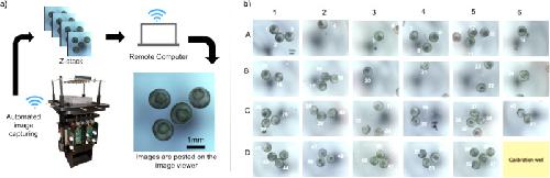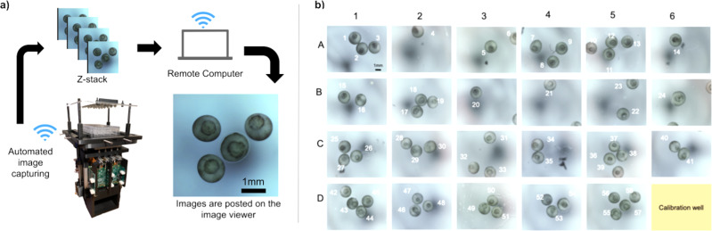 Fig. 5. System architecture.a The images are autonomously collected and wirelessly transferred to a remote computer for viewing or post processing. b Image of 23 wells observing 57 frog embryos. |