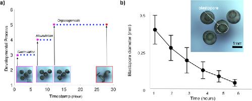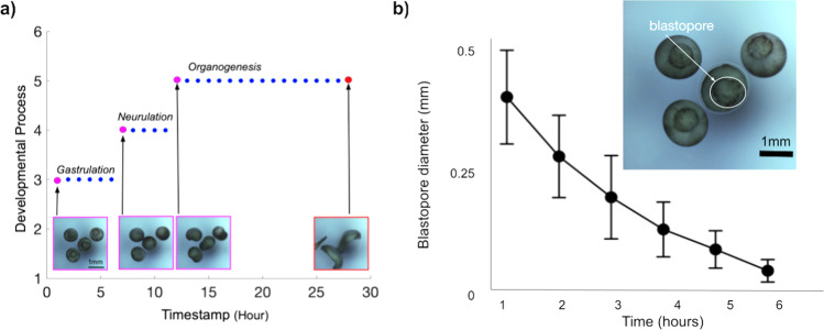 Fig. 7. Longitudinal imaging allows the tracking of individual developmental processes.a The images shown in Fig. 6 were taken hourly over a 28 h period and encompass three developmental stages: Gastrulation, neurulation, and organogenesis. Y-Axis represents the stages of frog embryonic development: 1 = Fertilization, 2 = Cleavage, 3 = Gastrulation, 4 = Neurulation, 5 = Organogenesis, and 6 = Metamorphosis. X-axis represents the timepoint at which it occurs. Each dot in the plot represents a timepoint in which the images were taken. Magenta = the beginning of each developmental process. Red = the end of the experiment at 28 h. Blue = intermediate timepoints. b Diameter of the blastopore is reduced over time from gastrulation to neurulation. Top right-hand panel shows an example of an individual blastopore. A total of 27 embryos were considered for the analyses. Error bars represent Standard Deviation (SD). |