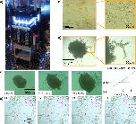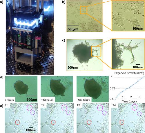 Fig. 8. In-incubator imaging of mammalian cell and cortical organoid models.a The Picroscope inside a standard tissue culture incubator. b Imaging of human embryonic stem cells as a model of 2D-monolayer cell cultures. c Longitudinal imaging of human cortical organoids embedded in Matrigel. Zoomed images show cellular outgrowths originating in the organoids. d Tracking of cortical organoid development over 86 h. Images were taken hourly. On left. Images of the tracked organoid at timepoints 0, 43, and 86. On right. Measurement of organoid area at each timepoint analyzed. e Manual Longitudinal tracking of individual cells in embedded cortical organoids over 40 min. Images were taken every 10 min. Magenta = example of cell division, Red = example of cell migration, and Purple = example of morphological changes. |