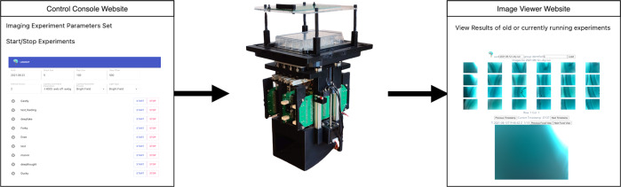Fig. 2. Basic workflow from Control Console to Image Viewer.The Control Console passes commands and experiment parameters to Picroscope, which uploads results to a server allowing them to be viewed through the Image Viewer website. |