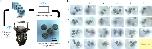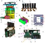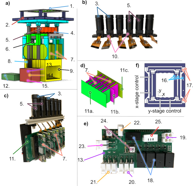 Fig. 3. The Picroscope.a Physical representation of the proposed imaging system. b One line of independent cameras. c An integrated rack of cameras and Raspberry Pi board computers. d The interlacing strategy of four independent racks of power distribution boards. e The Raspberry Pi Hub and Arduino Uno, Motor driver and custom relay board. f The XY adjustment stage. 1 = Over-the-plate illumination board, 2 = 3D printed Cell Culture Plate Holder and XY stage, 3 = Lenses, 4 = Illumination Board from below, 5 = 3D Printed Camera Bodies, 6 = 3D Printed Elevator, 7 = Raspberry Pi Zero W, 8 = Motors, 9 = Base, 10 = Raspberry Spy Cameras, 11 = Interface Board a. row 1, b. rows 2 and 3c. row 4, 12 = Pi Hub -- Raspberry Pi 4, 13 = Custom Relay Board, 14 = Adafruit Motor/Stepper/Servo Shield for Arduino v2, 15 = Arduino Uno, 16 = Leaf Springs, 17 = Rigid Elements, 18 = Relays, 19 = Limit switches connectors, 20 = Power distribution board connectors, 21 = Light board connectors, 22 = Motor power connector, 23 = 12 V power source, 24 = Voltage regulators, and 25 = Temperature & Humidity sensor. |