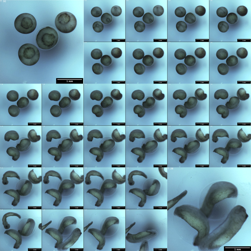 Fig. 6. Longitudinal imaging of Xenopus tropicalis development.Images of a representative well in which 4 frog embryos developed over a 28 hour period. Images were taken hourly. White Balance adjusted for visibility. |