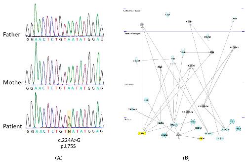 Figure 1. Identified variants in the ZBTB26 gene and IPA Network analysis with known CH genes. (A) Sequence of trio with unaffected parents and affected child. Sanger sequencing in index case demonstrates a de novo variant c.224A>G in the ZBTB26 gene which was not present in the unaffected parents. (B) Ingenuity (IPA) Network analysis. Known genes from the literature (in blue color) underlying congenital primary hypothyroidism were analyzed using the IPA network analysis. The newly identified ZBTB26 gene was added to predict functional connections in the context of known protein networks. ZBTB26 and PAX8, both located in the nucleus, are highlighted in yellow. They are connected via NKX2-1 and UBEI. BOREALIN is also called CDCA8.