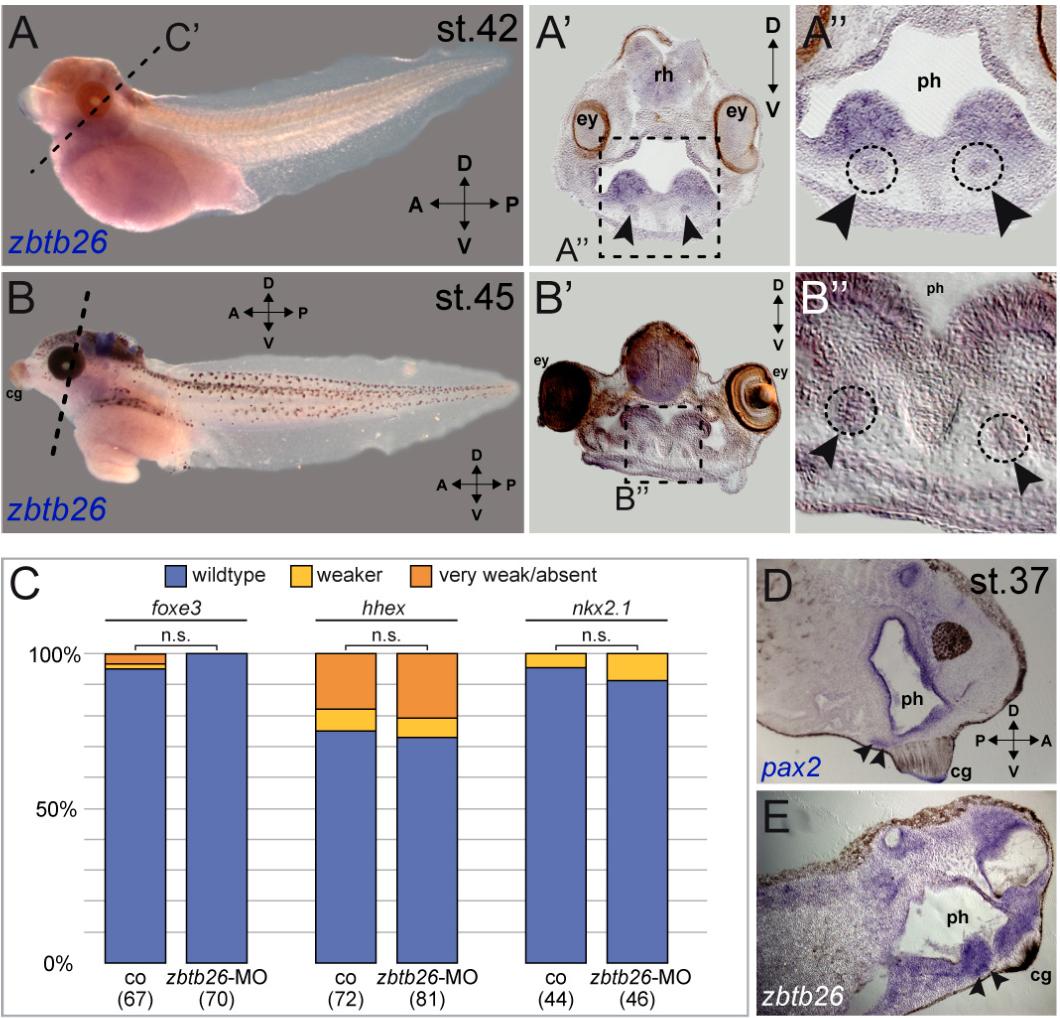 (F) Unilateral loss of zbtb26 negatively affects development of the thyroid anlage in the morphant half of the embryos. Dot plot of size ratios of the two thyroid anlagen of one embryo. Quantification shows significantly reduced size of morphant versus control side in unilaterally injected embryos (right) but not right versus left sides in control embryos (left). A, anterior; cg, cement gland; co, control; d, dorsal; ey, eye; n.s., not significant; ph, pharynx; P, posterior; Rh, rhombencephalon; st., stage; V, ventral. Sample numbers indicated in brackets (number of embryos in C and F). *p<0.05, **p<0.01, ***p<0.001