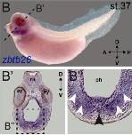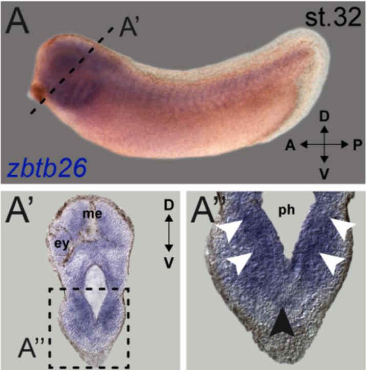 zbtb26 (zinc finger and BTB domain containing 26) gene expression in X. laevis embryo, assayed via in situ hybridization at NF stage 32, lateral view, anteriorright, dorsal up, and in transverse sections as indicted.