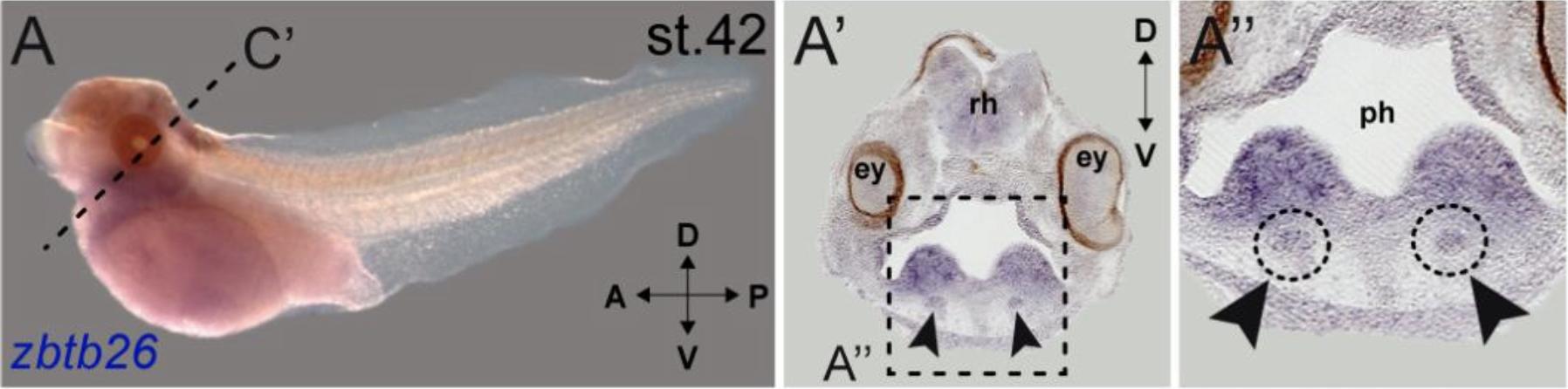 zbtb26 (zinc finger and BTB domain containing 26) gene expression in X. laevis embryo, assayed via in situ hybridization at NF stage 42, lateral view, anteriorright, dorsal up, and in transverse sections as indicted. Arrow heads point to thyroid primordia