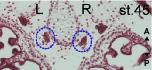 Histological section through pharyngeal region of a X. laevis embryo at NF stage 45, showing normal appearance of left (L) and right (R) thyroid gland primoridum, circled in blue.
