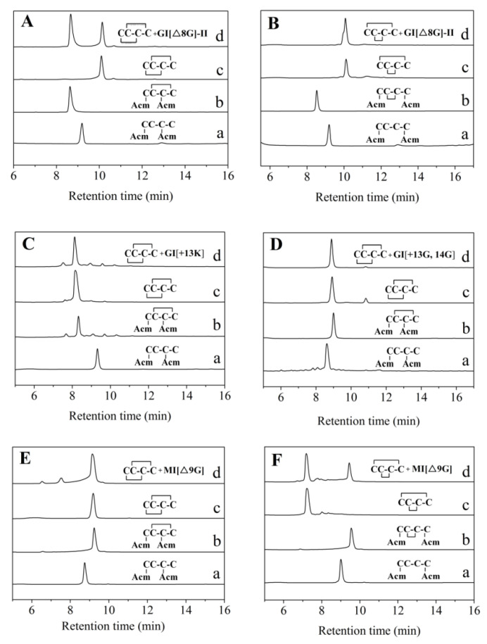 Figure 2. HPLC analyses of the folded products of linear GI and MI variants with Acm modification. (A) Linear GI[Δ8G]-I with Acm modifications at Cys1 and Cys3. (B) Linear GI[Δ8G]-II with Acm modifications at Cys1 and Cys4. (C) Linear GI[+13K] with Acm modifications at Cys1 and Cys3. (D) Linear GI[+13G, +14G] with Acm modifications at Cys1 and Cys3. (E) Linear MI[Δ9G]-I with Acm modifications at Cys1 and Cys3. (F) Linear MI[Δ9G]-II with Acm modifications at Cys1 and Cys4. Traces from bottom to top: linear peptide (a), primary oxidized product (b), secondary oxidized product (c), and co-elution of the two-step folding product and one-step natural-air folding oxidation product (d). HPLC analysis conditions are the same as in Figure 1.