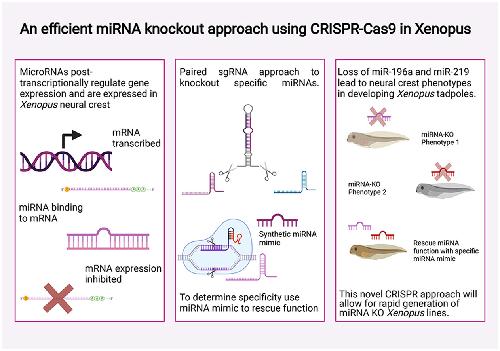 In recent years CRISPR-Cas9 knockouts (KO) have become increasingly ultilised to study gene function. MicroRNAs (miRNAs) are short non-coding RNAs, 20-22 nucleotides long, which affect gene expression through post-transcriptional repression. We previously identified miRNAs-196a and -219 as implicated in the development of Xenopus neural crest (NC). The NC is a multipotent stem-cell population, specified during early neurulation. Following EMT, NC cells migrate to various points in the developing embryo where they give rise to a number of tissues including parts of the peripheral nervous system, pigment cells and craniofacial skeleton. Dysregulation of NC development results in many diseases grouped under the term neurocristopathies. As miRNAs are so small, it is difficult to design CRISPR sgRNAs that reproducibly lead to a KO. We have therefore designed a novel approach using two guide RNAs to effectively 'drop out' a miRNA. We have knocked out miR-196a and miR-219 and compared the results to morpholino knockdowns (KD) of the same miRNAs. Validation of efficient CRISPR miRNA KO and phenotype analysis included use of whole-mount in situ hybridization of key NC and neural plate border markers such as Pax3, Xhe2, Sox10 and Snail2, q-RT-PCR and Sanger sequencing. To show specificity we have also rescued the knockout phenotype using miRNA mimics. MiRNA-219 and miR-196a KO's both show loss of NC, altered neural plate and hatching gland phenotypes. Tadpoles show gross craniofacial and pigment phenotypes.