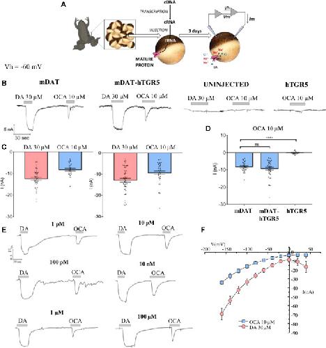 FIGURE 1. OCA generates an electrical current through the DAT. (A) Schematic representation of oocyte collection, cRNA synthesis and injection, and TEVC technique. (B) Representative traces of currents recorded by TEVC (Vh = −60 mV) from oocytes expressing mDAT, without or with hTGR5, uninjected, or expressing hTGR5 alone. The oocytes were perfused with 30 µM DA or 10 µM OCA. (C) Mean of the maximal DA-associated and OCA-induced currents (I nA ± SE of 14–47 oocytes, 6–11 batches) in oocytes expressing mDAT (C, left) or mDAT plus TGR5 (C, right). (D) Mean of the maximal OCA-induced currents in oocytes expressing the proteins indicated; one-way ANOVA F(2,74) = 36.13, p < 0.0001 followed by Tukey’s multiple comparison test (mDAT vs mDAT-hTGR5 p = 0.566, mDAT vs hTGR5 p < 0.0001). (E) Representative traces of currents recorded by TEVC (Vh = −60 mV) from oocytes tested with DA (30 µM) and OCA at the indicated concentrations. The current of each trace was normalized to the mean current of dopamine to reduce the variability between batches. (F) I/V relationships of DA (30 µM) and OCA (10 µM)-induced currents.