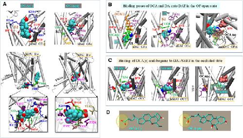FIGURE 6. OCA binding to DAT depends on its protonation state and on DAT conformation. (A) Binding of negatively charged (left) and neutral (right) OCA (cyan) to hDAT in the OFo