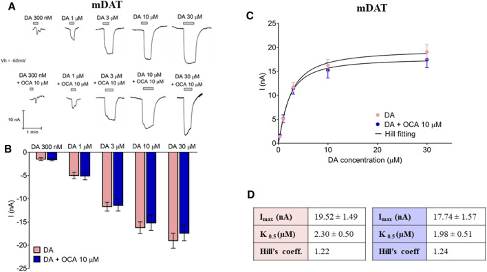 FIGURE 4. OCA does not alter the DA transport associated current. (A) Representative traces of the current recorded at increasing concentrations of DA in the absence or presence of 10 µM OCA. (B) Mean currents recorded from the traces in (A). Two-way ANOVA, Treatment F(1,142) = 0.51, p = 0.476 – DA concentration F(4,142) = 77.76, p < 0.0001 – Interaction F(4,142) = 0.24, p = 0.915. (C) Data from (A) were fitted to a Hill equation. (D) Imax, K0.5, and Hill coefficient obtained from fitting the data represented in (B) to the Hill equation.