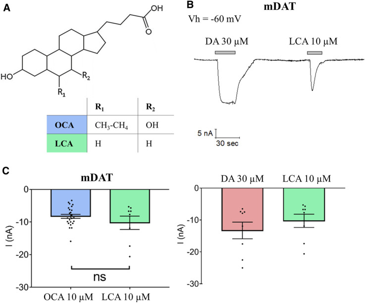 FIGURE 5. LCA induces a current that parallels the OCA-induced current. (A) Structure of OCA and LCA (B) Representative trace of current recorded with TEVC (Vh = −60 mV) in oocytes expressing mDAT and perfused with 30 µM DA or 10 µM LCA in ND98 buffer (top). Mean of maximal dopamine transport-associated and LCA-induced currents (I nA ± SE of 8 oocytes, 3 batches) (bottom). (C) Mean of maximal currents elicited by OCA or LCA in mDAT-expressing oocytes (n = 8; p = 0.22 by Student’s t-test).