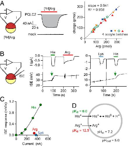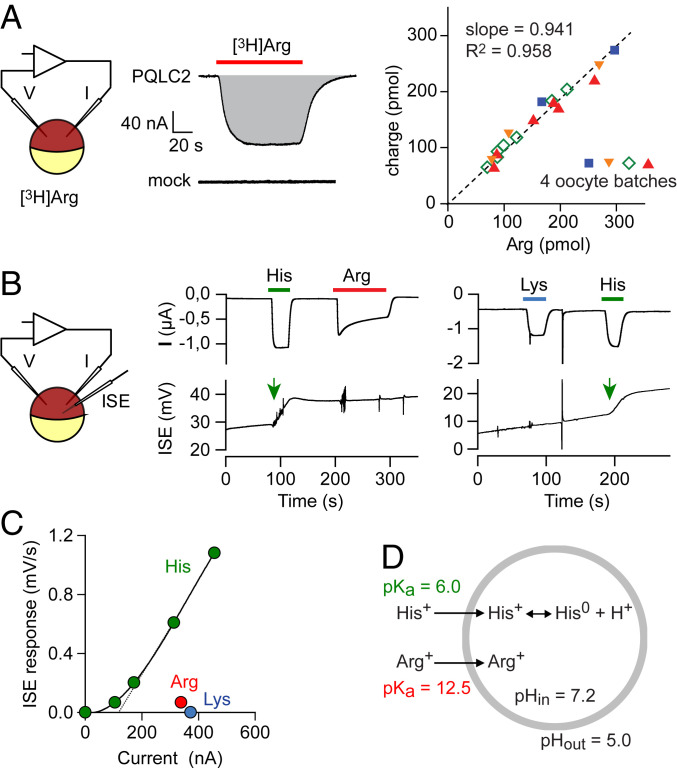 Fig. 1. PQLC2 is not driven by protons. (A) Charge–substrate ratio measurements. Representative current traces elicited by [3H]Arg in a PQLC2 oocyte and a negative control. The accumulated charge (shaded area) is proportional to accumulated Arg with a slope of 0.94 elementary charge per molecule. (B and C) Intracellular pH measurements with an ion-selective electrode (ISE). His (arrows), but not Arg or Lys, applied to PQLC2 oocytes at pH 5.0 induces an intracellular acidification. The graph in C shows a representative example of the acidification/current relationship. (D) Model for the His-induced acidification.