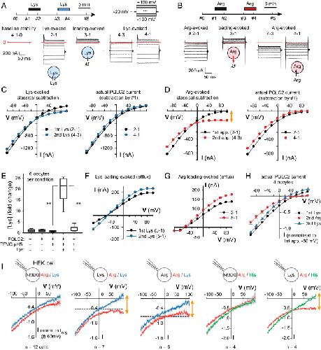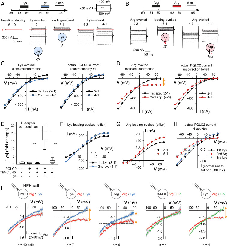 Fig. 3. Argout inwardly rectifies the PQLC2 current. (A–D) Voltage dependence of the Lys and Arg currents. Naive PQLC2 oocytes were perfused twice with either 20 mM Lys or 20 mM Arg and subjected to voltage jumps every 20 s. Representative PQLC2 current traces in A and B were obtained by subtracting the raw current recorded at the corresponding tick marks on the time’s arrow. With Arg, the outward current observed during the wash steps (3 − 1 subtraction) is fully suppressed by the presence of Arg in the bath (2 − 1 and 4 − 1 subtractions). C and D show the corresponding I–V curves during substrate application. In each panel, two subtraction procedures are compared. (Left) The result of the classical subtraction procedure, which induces an artifact during the second application of Arg (double arrow), reflecting the suppression of the outward current by Argout. (Right) The actual PQLC2 current. (E) Oocytes were perfused 5 min with 20 mM, Lys and their Lys content was measured by liquid chromatography coupled to high-resolution mass spectrometry (LC–HRMS). **P ≤ 0.002. (F and G) I–V curves of the PQLC2 current recorded during the wash steps of the oocytes shown in A and B. The outward current reflects the efflux of accumulated Lys or Arg molecules. Its shift to an inward current at negative potential may reflect the reentry of Lys or Arg molecules leaving the oocyte at holding potential. (H) Mean I–V curves of four oocytes successively perfused with 20 mM Lys, Arg, and Lys again. (I) Whole-cell patch-clamp recording of PQLC2 in HEK cells. The mean current ± SEM (gray shading) evoked by 20 mM CAAout is plotted against voltage. CAAin (20 mM) was delivered, or not (20 mM NMDG), through the patch-clamp pipette. In CAA-loaded cells, the actual PQLC2 current cannot be determined owing to the lack of zero-in, zero-out reference. The dashed line shows its expected zero value based on the null reversal potential in symmetrical conditions. The double arrows reflect the suppression of the PQLC2 outward current by extracellular Arg.