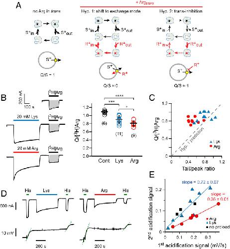Fig. 5. Arginine transinhibits PQLC2. (A) Potential mechanisms for the Arg effect. The exchange and trans-inhibition mechanisms differentially alter the charge–substrate ratio (Q/S) of the transport cycle. (B) Charge–substrate ratio measurements in PQLC2 oocytes preloaded, or not, for ≥8 min at −60 mV with 20 mM Lys or Arg. Representative traces and mean ratio values for 6 to 11 oocytes per condition. *P = 0.025; ***P ≤ 0.001; ****P ≤ 10−5. (C) The charge–substrate ratio is plotted against the PQLC2 current decrease during the loading step. (D) PQLC2 oocytes perfused with a brief pulse of His before and after sustained loading with either Lys or Arg were recorded with an intracellular H+-selective electrode under voltage clamp. Representative current (Top) and pH electrode (Bottom) traces. The green dotted lines highlight the decreased acidification rate after Arg loading. (E) Relationship between the His-evoked acidification before and after Lys or Arg loading. The results are compared to those of PQLC2 oocytes without intervening loading steps (black squares).