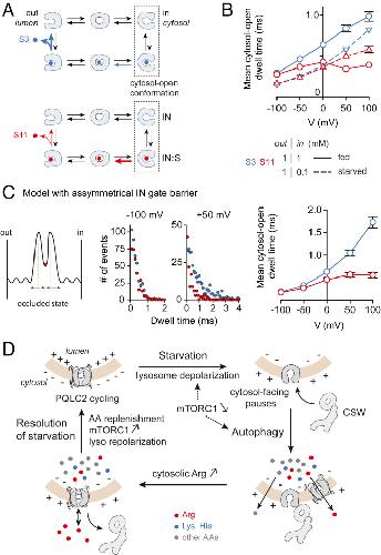 Fig. 7. Lysosomal depolarization and the Arg-like substrate S11 antagonistically control the cytosol-facing conformation. (A) Kinetic differences induced by substrates 3 and 11 in the uniporter model. (B) The voltage dependence of the dwell time in cytosol-facing conformation was determined from single-transporter simulations in conditions mimicking nutrient replete and starved conditions (cytosolic substrate at 1 and 0.1 mM, respectively). Mean ± SEM of five 200-ms simulations, representing 100 to 750 events per condition. (C) Single-transporter simulations were repeated for a uniporter with an asymmetrical energy barrier of the cytosolic gate and otherwise identical model parameters. Dwell time distributions at two potentials and voltage dependence of the mean dwell time in cytosol-facing conformation (60 to 700 events per condition). (D) Putative model for the regulation of the interaction between PQLC2 and the CSW complex by the nutrient status. Lysosomal depolarization and cytosolic Arg may antagonistically control this interaction by increasing and shortening the duration of PQLC2 pauses in cytosol-facing conformation.