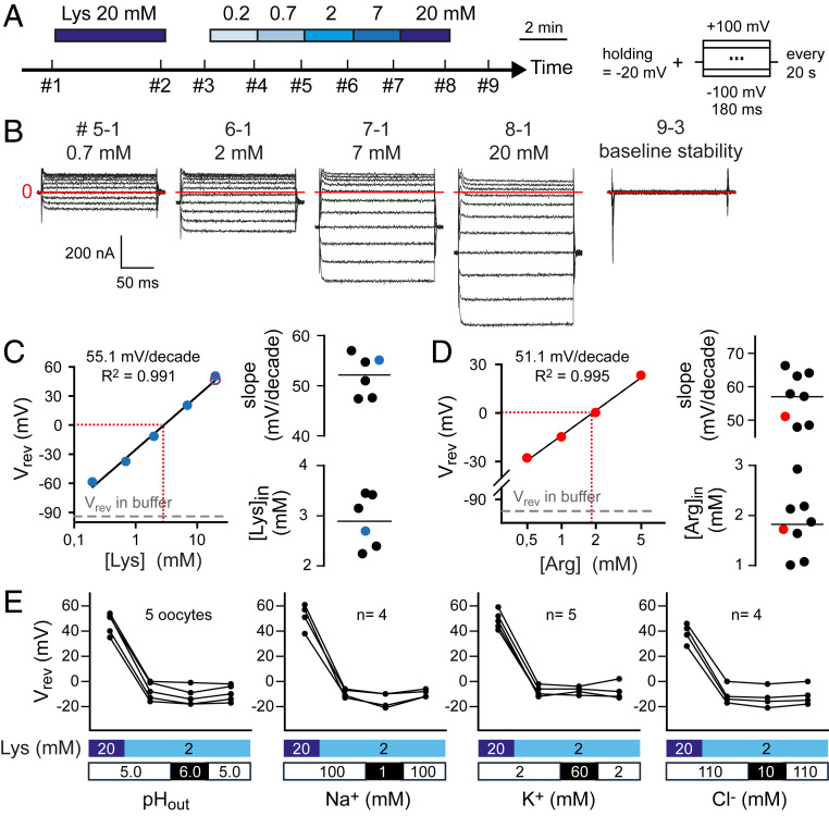 Fig. 2. PQLC2 is a cationic amino acid uniporter. (A) Protocol used for reversal potential measurements. After accumulating Lys through PQLC2, the oocyte is equilibrated with varying Lysout concentrations and subjected to voltage jumps. (B) Representative Lys-evoked current traces, obtained by subtracting the raw currents recorded at the numbered tick marks on the time’s arrow in A. (C) Lysout dependence of Vrev for the oocyte shown in B (blue dots) and five other PQLC2 oocytes. Vrev is proportional to log([Lys]out) with a mean slope 52 ± 2 mV/decade, consistent with the translocation of one elementary charge per Lys molecule. The internal Lys concentration is deduced from this relationship (red dotted line). The value of Vrev at the end of the Lys-loading phase (open purple dot) shows that a constant [Lys]in was maintained throughout the experiment. (D) Vrev measurements obtained with Arg as substrate. (E) Vrev is not affected by 10- to 100-fold changes in the external concentrations of H+, Na+, K+, and Cl−.