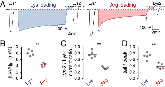 Fig. 4. Argin selectively reduces the inward current. Naive PQLC2 oocytes were perfused with a brief pulse of 20 mM Lys before and after sustained loading with 20 mM Lys or Arg at −60 mV. (A) Representative current traces. (B) Internal amino acid levels determined from the time integral of the loading currents based on an oocyte volume of 0.5 µL. (C) Ratio between the two pulse currents. (D) Current decrease during the loading step (arrows in A). The colored dots correspond to the oocytes shown in A. **P < 0.01.