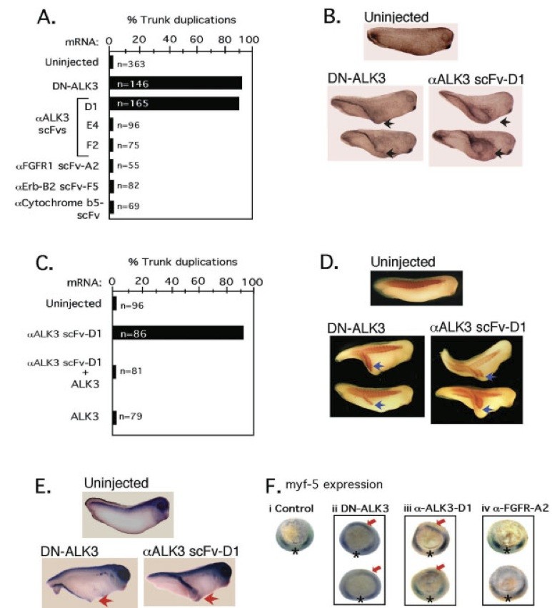 We evaluated the use of single-chain antibody (scFv) expression as a tool to disrupt the function of specific proteins in embryos of the frog, Xenopus laevis. The expression of scFvs that recognize the bone morphogenetic protein receptor (ALK3) or the fibroblast growth factor receptor1 (FGFR1) as endoplasmic reticulum-anchored proteins caused distinct developmental defects that were virtually indistinguishable from the defects caused by expression of the dominant negative forms of each receptor. These results demonstrate that scFvs from phage-display libraries can be readily fashioned into effective and specific inhibitors of signaling pathways in developing embryos. In addition, as several effective scFvs against a specific target can be isolated rapidly, this approach represents a valuable new tool for large-scale functional analysis of the embryonic proteome.