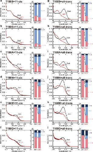 Fig. 2. Binding selectivity of retinal isomers in Opn5m Thr188 mutant proteins.a–f (left) Absorption spectra of Opn5m T188S (a), T188G (b), T188A (c), T188N (d), T188M (e), and T188Q (f) mutant proteins purified after the addition of 11-cis retinal to the collected cell membranes. The spectra were recorded at 0 °C in the dark (curve 1) and after yellow light irradiation (curve 2). Spectral change by light irradiation is shown in Supplementary Fig. 3. (right) Retinal configuration changes of Opn5m T188S (a), T188G (b), T188A (c), T188N (d), T188M (e), and T188Q (f) mutant proteins purified after the addition of 11-cis retinal to the collected cell membranes. The retinal isomers before and after yellow light (>500 nm) irradiation were analyzed with HPLC after extraction of the chromophore as retinal oximes. (Supplementary Fig. 4a–f). g–l (left) Absorption spectra of Opn5m T188S (g), T188G (h), T188A (i), T188N (j), T188M (k), and T188Q (l) mutant proteins purified after the addition of all-trans retinal to the collected cell membranes. The spectra were recorded at 0 °C in the dark (curve 1) and after yellow light irradiation (curve 2). Spectral change by light irradiation is shown in Supplementary Fig. 3. (right) Retinal configuration changes of Opn5m T188S (g), T188G (h) T188A (i), T188N (j), T188M (k), and T188Q (l) mutant proteins purified after the addition of all-trans retinal to the collected cell membranes. The retinal isomers before and after yellow light (>500 nm) irradiation were analyzed with HPLC after extraction of the chromophore as retinal oximes. (Supplementary Fig. 4g–l).