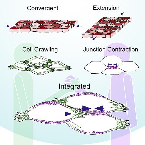 Convergent extension (CE) is an evolutionarily conserved collective cell movement that elongates several organ systems during development. Studies have revealed two distinct cellular mechanisms, one based on cell crawling and the other on junction contraction. Whether these two behaviors collaborate is unclear. Here, using live-cell imaging, we show that crawling and contraction act both independently and jointly but that CE is more effective when they are integrated via mechano-reciprocity. We thus developed a computational model considering both crawling and contraction. This model recapitulates the biomechanical efficacy of integrating the two modes and further clarifies how the two modes and their integration are influenced by cell adhesion. Finally, we use these insights to understand the function of an understudied catenin, Arvcf, during CE. These data are significant for providing interesting biomechanical and cell biological insights into a fundamental morphogenetic process that is implicated in human neural tube defects and skeletal dysplasias.
