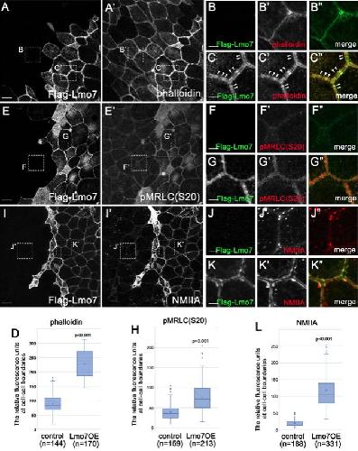 Figure 3. Lmo7 promotes actomyosin bundle formation at apical junctions. Effects of Flag-Lmo7 overexpression on peri-junctional actomyosin networks. Flag-Lmo7 RNA (1â ng) was injected into one blastomere of four- to eight-cell stage embryos. Stage 11 embryos were co-stained with phalloidin, anti-Flag, anti-pMRLC or anti-NMIIA antibodies, as indicated. The superficial ectoderm was imaged. (A-Câ³) F-actin bundle formation in cells expressing Flag-Lmo7. Areas marked by rectangles in A,Aâ² are enlarged in B-Câ³. (C-Câ³) Lmo7 double bands between two adjacent Flag-Lmo7-expressing cells overlap with F-actin double bands. There are periodic sarcomere-like structures (arrowheads). (D) Phalloidin fluorescence intensity was measured at the borders between two adjacent control cells (control) or two Lmo7-expressing cells (Lmo7OE). (E-Gâ³) MRLC phosphorylation at Ser 20. Areas marked by rectangles in E-Eâ² are enlarged in F-Gâ³. (H) Fluorescence intensity of pMRLC(S20) staining related to images in E-Gâ³. (I-Kâ³) NMIIA accumulation. Areas marked by rectangles are enlarged in J-Kâ³. (L) Fluorescence intensity of NMIIA staining related to images in I-Kâ³. The boxes and whiskers indicate the lower and upper quartiles, and variability outside the upper and lower quartiles. Statistical significance of the difference was assessed by the MannâWhitney U-test. Scale bars: 10â µm in A,E,I; 2â µm in B,C,F,G,J,K. Images shown are representative of two to four experiments. |