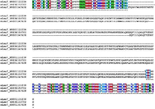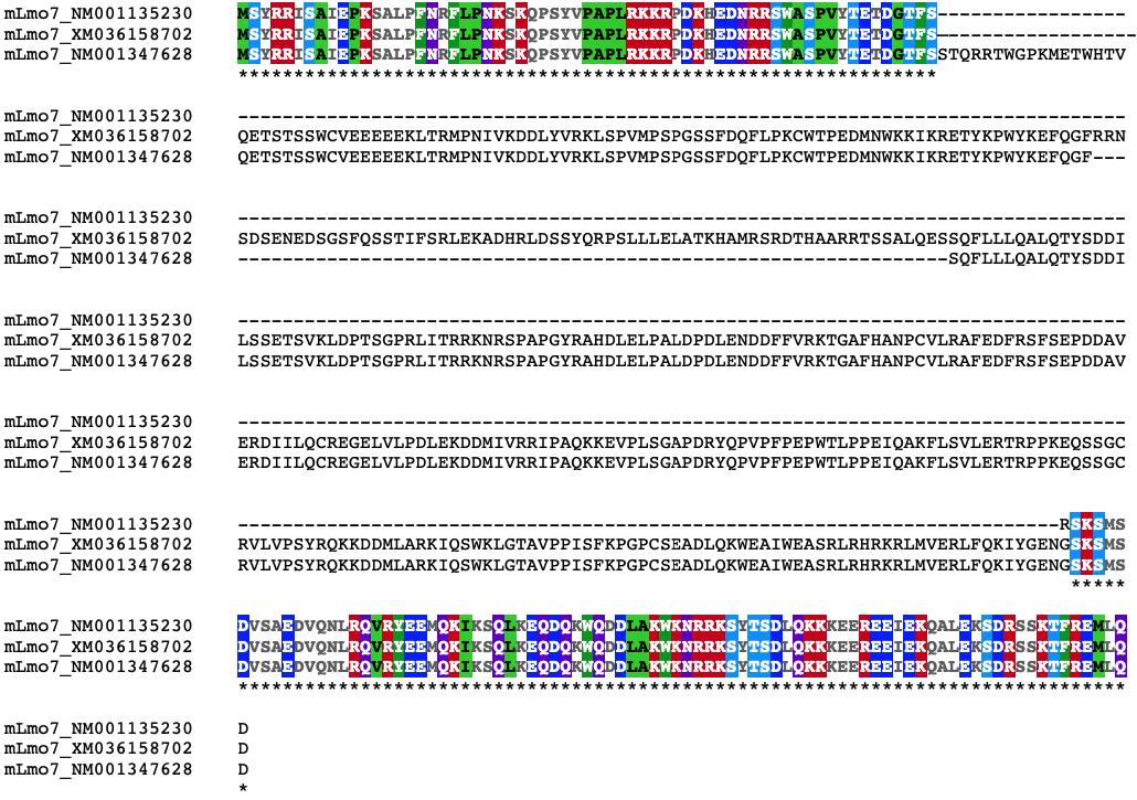 Fig. S8. Sequence alignment of DUF4757/NMIIBD among mouse Lmo7 splice variants The DUF4757/NMIIBD were compared among three splice variants of Mus musculus Lmo7; NM_001135230, XM_036158702 and NM_001347628. Evolutionally conserved positively charged, negatively charged, hydrophobic and hydrophilic amino acids are marked by red, blue, green and purple as shown in Figure 7B. Conserved Ser/Thr are marked by light blue. |