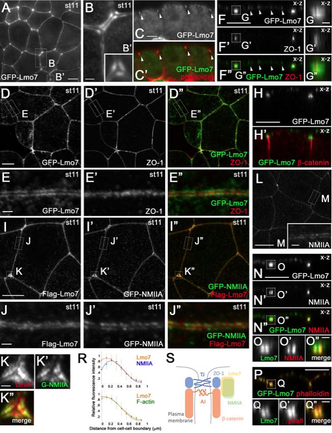 Figure 1. Lmo7 localizes at junctional actomyosin bundles in Xenopus ectoderm cells. (A-Qâ³) Xenopus embryos were injected into animal blastomeres with GFP-Lmo7 or Flag-Lmo7 RNA (200â pg) or GFP-NMIIA RNA (300â pg) as indicated and the superficial ectoderm was imaged at stage 11. Protein localization was evaluated by direct GFP fluorescence, or by indirect immunofluorescence for Flag-Lmo7, endogenous NMIIA, ZO-1 and β-catenin. (A) Peri-junctional GFP-Lmo7 localization. Areas marked by rectangles are enlarged in B and Bâ². (B) Peri-junctional double bands of GFP-Lmo7 are more evident in shorter cell-cell junctions. (Bâ²) GFP-Lmo7 is enriched near tricellular junctions but excluded from them. (C,Câ²) Cryosections of the superficial layer of ectoderm showing GFP-Lmo7 localization at the most apical region of the lateral membrane (arrowheads), co-stained with phalloidin. (D-Gâ³) Relative distribution of GFP-Lmo7 and endogenous ZO-1 in x-y view (D-Eâ³) and x-z view (F-Gâ³). Areas marked by rectangles in D-Dâ³ and F-Fâ³ are enlarged in E-Eâ³ and G-Gâ³, respectively. (H,Hâ²) Relative localization of GFP-Lmo7 and endogenous β-catenin in x-z view. (I-Jâ³) Relative localization of Flag-Lmo7 and GFP-NMIIA. Bi-cellular junctions and tricellular junctions marked by rectangles and squares in I-Iâ³ are enlarged in J-Jâ³ and K-Kâ³, respectively. (L,M) Endogenous NMIIA localization. An area marked by a rectangle is enlarged in M. (N-Oâ³) Relative localization of GFP-Lmo7 and endogenous NMIIA in x-z view. Areas marked by rectangles in N-Nâ³ are enlarged in O-Oâ³. (P-Qâ³) Relative localization of GFP-Lmo7 and F-actin. An area marked by a rectangle in P is enlarged in Q-Qâ³. (R) Quantification of GFP-Lmo7, NMIIA and F-actin fluorescence intensity near apical junctions. The cell-cell boundary is defined as 0 on the x-axis. GFP-Lmo7 is located closer to the cell-cell boundary (0.138â µm) than NMIIA (0.272â µm) (upper panel, n=28, P<0.001). There is no statistically significant difference between GFP-Lmo7 (0.139â µm) and F-actin (0.101â µm) (lower panel, n=16, P>0.25). Spearman's correlation coefficient is 0.9959 and 0.9879 in GFP-Lmo7 and NMIIA in the upper panel, and 0.9943 and 0.9968 in GFP-Lmo7 and F-actin in the lower panel. (S) Schematics of the relative distribution of Lmo7 in apical junctions. Scale bars: 10â µm in A,C,D,F,H,I,L,N,P; 2â µm in B,E,G,J,K,M,O,Q. Images shown are representative of two to five experiments. |