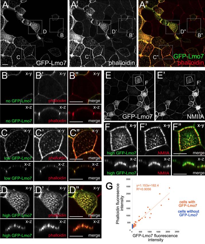 Figure 4. Lmo7 promotes actomyosin bundle formation at the medioapical cortex. GFP-Lmo7 RNA (1â ng) was injected into one blastomere of four- to eight-cell stage embryos. Images show the superficial ectoderm of stage 11 embryos co-stained with phalloidin or NMIIA antibodies. (A-Dâ³) F-actin accumulation at the medioapical cortex in cells expressing GFP-Lmo7. Areas marked by rectangles in A-Aâ³ are enlarged in B-Dâ³. x-y views and x-z views are shown for uninjected cells (B-Bâ³) and cells expressing low (C-Câ³) and high (D-Dâ³) levels of GFP-Lmo7. (E-Fâ³) NMIIA accumulation at the medioapical cortex in GFP-Lmo7-expressing cells. Areas marked by rectangles are enlarged in F-Fâ³. x-y view and x view are shown. (G) Quantification of medioapical GFP-Lmo7 and F-actin related to images in A-Dâ³. Fluorescence intensities of medioapical GFP-Lmo7 (x-axis) and phalloidin (y-axis) are shown. Each dot represents one cell. GFP-Lmo7 increases the accumulation of F-actin at the medioapical cortex in a dose-dependent manner. Scale bars: 10â µm. Images shown are representative of two to four experiments. |