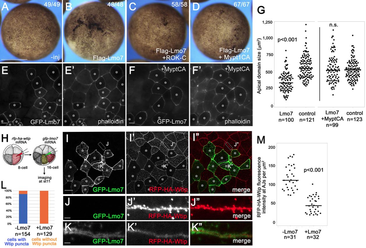 Figure 5. Effects of Lmo7 on actomyosin contractility require the Rho-ROCK-NMII pathway. (A-D) Pigment granule accumulation at stage 11. Two blastomeres of four- to eight-cell stage embryos were injected with relevant RNA. (A) Control uninjected and (B) Flag-Lmo7-treated (500â pg RNA) embryos. (C) Embryos injected with Flag-Lmo7 (500â pg RNA) and ROK-C (200â pg RNA), and (D) embryos injected with Flag-Lmo7 (500â pg RNA) and Mypt1CA (50â pg RNA). Images are representative of three experiments. (E-Fâ²) The en face view of the ectodermal cells expressing GFP-Lmo7 alone (200â pg RNA) (E,Eâ²) or together with MyptCA (50â pg RNA) (F,Fâ²). Asterisks indicate cells expressing relevant proteins. (G) Quantification of the apical surface area related to images in E-Fâ³. Individual data points are included with the median indicated by a horizontal line. (H-M) Lmo7 modulates RFP-HA-Wtip localization. (H) Experimental design. Embryos were sequentially injected into a ventral blastomere with RFP-HA-Wtip RNA (200â pg) (in red, four- to eight-cell stage) and GFP-Lmo7 RNA (500â pg) (in yellow, 16- to 32-cell stage), causing protein co-expression in 25-50% cells at stage 11 (asterisks in I-Iâ³). (I-Iâ³) RFP-HA-Wtip puncta localization in cells with or without GFP-Lmo7. Areas in I-Iâ³ are enlarged in J-Kâ³. RFP-HA-Wtip forms puncta near apical junctions and the apical cortex in the absence of Lmo7. (J-Kâ³) Effects of Lmo7 on RFP-HA-Wtip puncta formation near apical junctions. RFP-HA-Wtip forms a smooth line between the Flag-Lmo7 double bands (K-Kâ³). (L) Quantification of the Lmo7 effect on RFP-HA-Wtip puncta formation near the apical cortex. Cells with and without apical Wtip puncta were counted in the control (âLmo7, n=154) and Lmo7-expressing cells (+Lmo7, n=129). (M) Quantification of the Lmo7 effect on RFP-HA-Wtip puncta near apical junctions. Fluorescence intensity of RFP-HA-Wtip near apical junctions was measured. Scale bars: 500â µm in A; 10â µm in E and I; 2â µm in J and K. Statistical significance of the difference was assessed by the MannâWhitney U-test. |