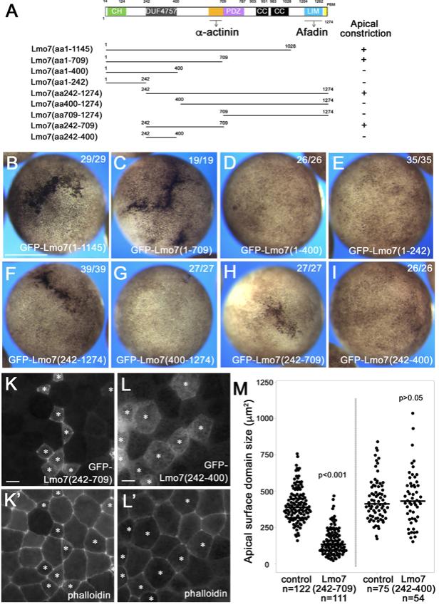 Figure 6. Identification of Lmo7 domains required for apical constriction. (A) Structure of Lmo7 and the mutants used in this study. Lmo7 has the N-terminal calponin homology (CH) domain, DUF4757, the α-actinin binding region, the PDZ domain, two coiled-coil domains and the C-terminal LIM domain. (B-I) Representative images of stage 11 embryos injected with RNA encoding various Lmo7 constructs (1â ng). Apical constriction was assessed by pigment granule accumulation. Apical constriction induced by Lmo7 constructs lacking the LIM domain (B), and the coiled-coil and PDZ domains (C). Deletion of the α-actinin-binding region (D) and DUF4757 (E) eliminates the activity of pigment granule accumulation, whereas CH domain deletion has no visible effect (F). Lmo7(aa 400-1274) lacking DUF4757 has no pigment granule accumulation activity (G). The region containing the DUF4757 domain and α-actinin-binding region Lmo7(aa 242-709) was the shortest fragment that induced pigment granule accumulation (H). The DUF4757 domain has no effect on its own (I). (K-Lâ²) Effects of GFP-Lmo7(aa 242-709) and GFP-Lmo7(aa 242-400) on apical domain size. GFP-Lmo7 deletion mutants were mosaically expressed by RNA injection (500â pg, asterisks) in four- to eight-cell stage embryos. GFP fluorescence and phalloidin staining are shown in stage 11 ectoderm. (M) Quantification of apical surface domain size related to K-Lâ². Apical domain surface size of control cells was measured only in cells that shared at least one cell boundary with cells expressing GFP-Lmo7 mutants. Images for scoring were taken from at least five embryos. Data are representative of more than three independent experiments. Individual data points are included with the median indicated by a horizontal line. Scale bars: 500â µm in B-I; 10â µm in K,L. Statistical significance of the difference was assessed by the MannâWhitney U-test. |