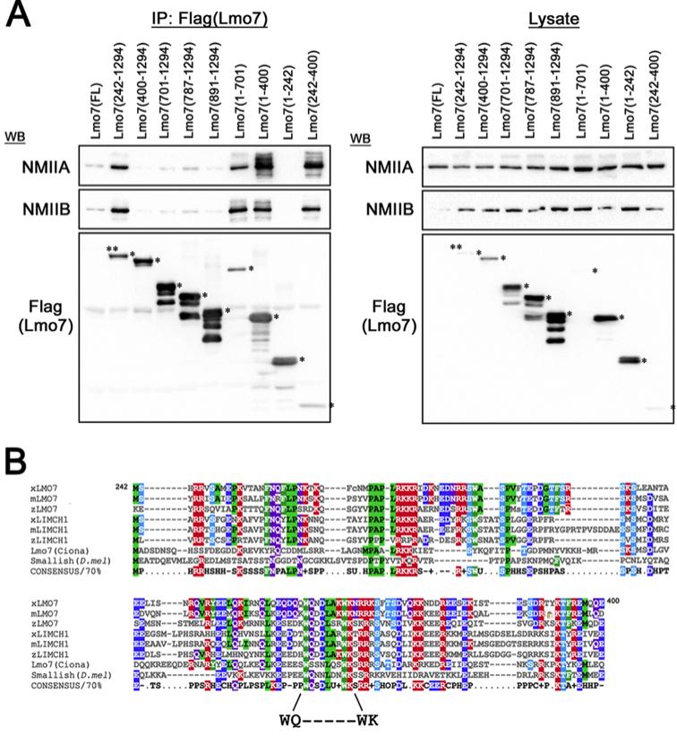 Figure 7. The DUF4757 domain binds to NMII heavy chain. (A) NMIIA and NMIIB co-precipitate with Flag-Lmo7 in HEK293 T cells. Asterisks indicate protein bands corresponding to full-length or deletion mutant forms of Lmo7. Lmo7(aa 242-400) containing DUF4757 is sufficient to co-precipitate endogenous NMIIA and NMIIB. (B) The alignment of DUF4757/NMIIBD sequences. Xenopus laevis Lmo7 (NM_001135230), Mus musculus Lmo7 (XM_006519190), Danio rerio Lmo7 (XM_021478660), Xenopus laevis LIMCH1 (NM_001096206), Mus musculus LIMCH1 (NM_001001980), Danio rerio LIMCH1 (XM_009291008), Ciona intestinalis Lmo7 (XM_002128910) and Drosophila melanogaster Smallish (NM_169014). Conserved positively charged, negatively charged, hydrophobic or hydrophilic amino acids are marked by red, blue, green and purple, respectively. Ser or Thr residues are marked by light blue. Consensus sequence based on amino acid similarity (>70%) is shown at the bottom. The conserved WQ-WK sequence used for AA-AA substitution is indicated. |