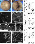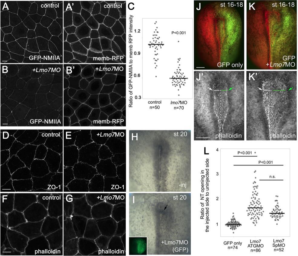 Figure 2. Lmo7 induces apical constriction in Xenopus ectoderm. (A,B) GFP-Lmo7 RNA (1â ng) was injected into two animal blastomeres of four- to eight-cell stage embryos. (A) Control uninjected embryo at stage 11. (B) Embryo expressing GFP-Lmo7 at stage 11 exhibiting apical pigment granule accumulation. (C,Câ²) Reduced apical domain in cells expressing GFP-Lmo7 (200â pg RNA) in stage 11 embryos. En face view of the ectoderm co-stained with phalloidin. Asterisks indicate GFP-Lmo7-expressing cells. (D) Quantification of apical domain surface size in cells expressing GFP-Lmo7 (n=101) and adjacent control cells (n=101). Images were taken from at least five embryos. (E-Fâ²) Cross-sections of the ectoderm in stage 11 embryos expressing GFP-Lmo7 RNA (200â pg). Embryos were co-stained with phalloidin. Arrowheads indicate GFP-Lmo7 or F-actin accumulation at the most apical region of the basolateral membrane. (G) The ratio of the apical to the basolateral domain length in the cells expressing GFP-Lmo7 (n=49) and uninjected control cells (n=49). (H,Hâ²) Increased apical domain in Lmo7-ATGMO cells. Lmo7-ATGMO (30â ng) was co-injected with membrane-tethered RNA (100â pg). The ectoderm from stage 11 embryos was co-stained with phalloidin, en face view. Asterisks indicate Lmo7-ATGMO-containing cells. (I) Quantification of apical domain size in Lmo7-ATGMO cells (n=58) and adjacent control cells (n=54). Images were taken from at least five embryos. Statistical significance of the difference between the median values was assessed by the MannâWhitney U-test. Scale bars: 500â µm in A; 10â µm in C,E,F,H. Images shown are representative of two or three experiments. |