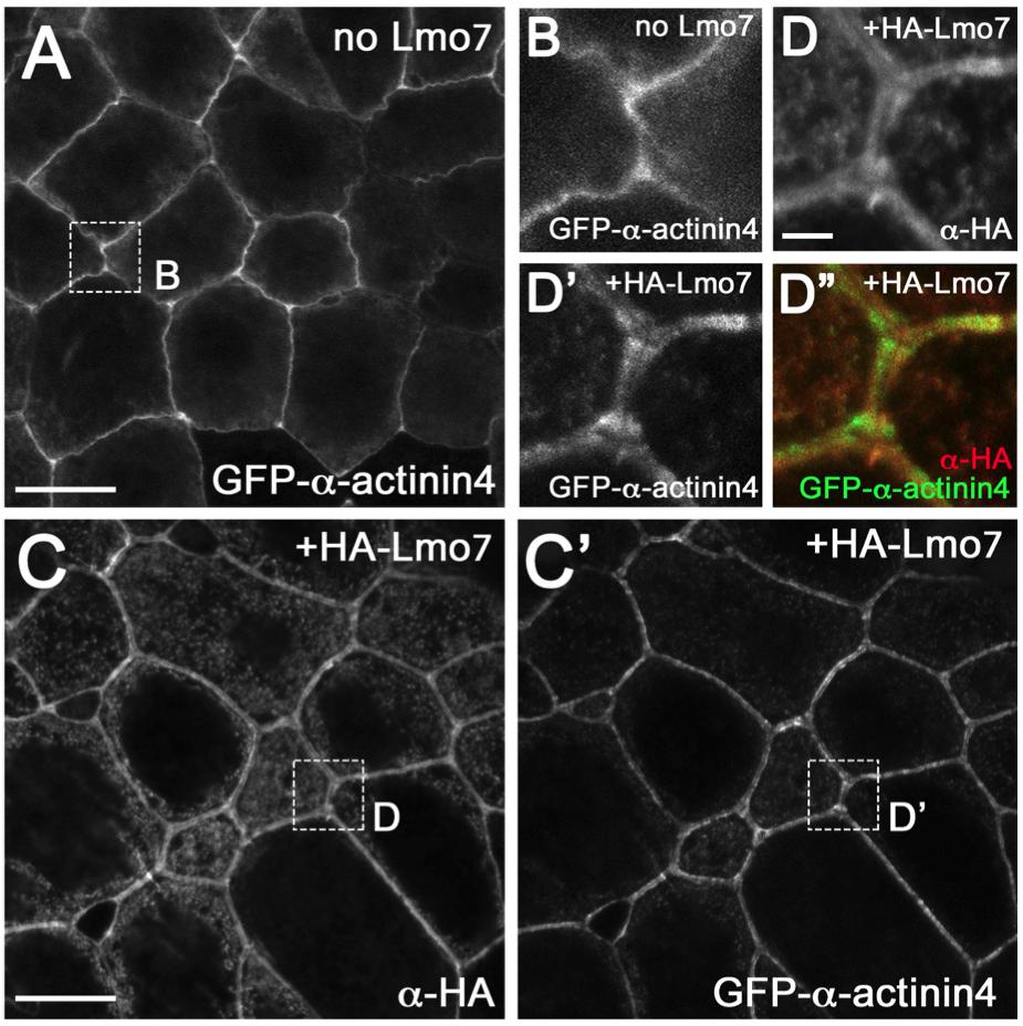 Fig. S2. Lmo7 promotes a-actinin enrichment in perijunctional actomyosin bundles RNA encoding GFP-a-actinin 4 (200 pg) was injected into 4-8 cell stage embryos with or without RNA encoding HA-Lmo7 (500 pg). (A, B) GFP-a-actinin 4 localizes at apical junctions and forms a single band. An area marked by a rectangle in A is enlarged in B. (C-Dâ) HA-Lmo7 promotes GFP- a-actinin 4 association with apical junctions. Areas marked by rectangles in C-Câ are enlarged in D-Dâ. GFP-a-actinin 4 forms thick double bands that largely overlap HA-Lmo7. Scale bars: 10 μm in A and C. 2 μm in D. |