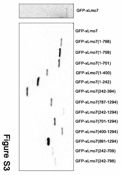 Fig. S3. Expression levels of GFP-Lmo7 constructs in Xenopus embryos GFP-Lmo7 construct RNAs (1 ng) were injected into 4-8 cell stage embryos. Total embryo lysates were collected at stage 11. Expression levels of GFP-tagged Lmo7 constructs were assessed by immunoblotting with anti-GFP antibodies. Long exposure of the sample from GFP-Lmo7-expressing embryos is shown on the left panel. |