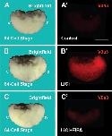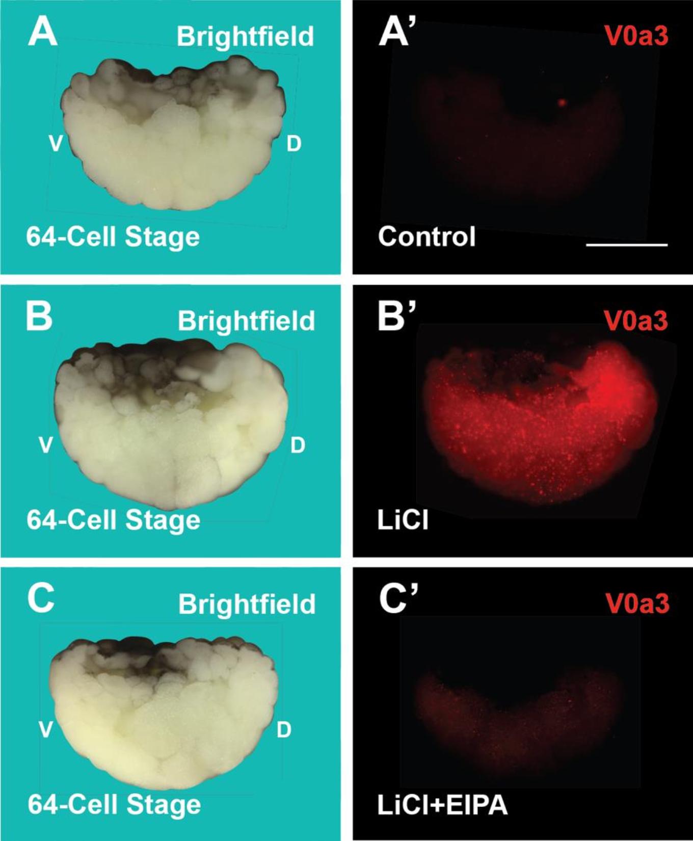 SI Appendix, Fig. S1. Microinjection of LiCl at 2-4 cell stage stabilized V-ATPase Subunit V0a3, particularly in dorsal cells, at the 64-cell stage, and this was blocked by the macropinocytosis inhibitor EIPA. Fixed embryos were bisected and the dorsal (D) and ventral (V) sides were determined by their pigmentation and thickening of the dorsal marginal zone. The anti-V0a3 antibody has been validated. (A and Aâ) Uninjected bisected embryos. (B and Bâ) LiCl microinjection strongly stabilizes the lysosomal V-ATPase subunit V0a3, especially on the dorsal side. (C and Câ) Co-injection of 1 mM EIPA, a micropinocytosis inhibitor prevents V-ATPase stabilization. D, dorsal; V, ventral. Embryos analyzed were as follows A, n=27; B, n=30; C, n=32 half-embryos with D-V polarity. Scale bars 500 ïm. |