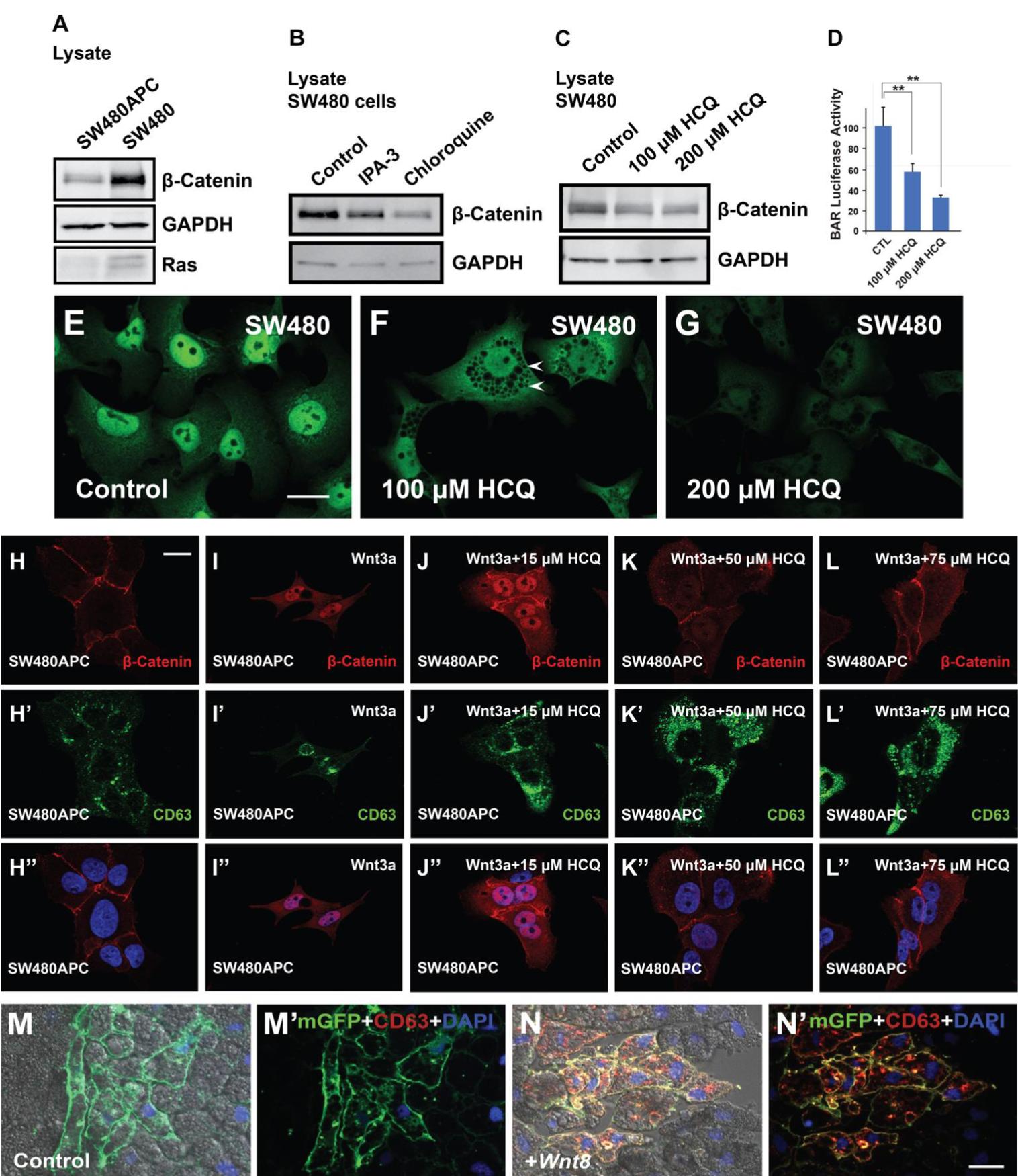 SI Appendix, Fig. S2. CQ and HCQ at high concentrations inhibit the constitutive Wnt signaling present in colorectal carcinoma SW480 cells in which the tumor suppressor APC is mutated; when APC is reconstituted in SW480-APC cells, low-dose HCQ expands the CD63-positive MVB compartment and increases nuclear β-catenin levels, whereas at high doses HCQ inhibits β-catenin accumulation while 3 retaining increased CD63 endosomes; in Xenopus ectodermal explants Wnt signaling causes the stabilization of CD63-RFP protein. (A) SW480 cells, but not SW480APC cells, have stabilized β- catenin and total Ras. GAPDH serves as a loading control. (B) CQ (250 μM) or the Pak-1 inhibitor IPA- 3 (2.5 μM) decrease β-catenin levels in SW480 cells. Pak-1 is a protein kinase required for macropinocytosis. (C) HCQ at high concentrations inhibits constitutive β-catenin levels in SW480 cells. (D) High-dose HCQ inhibits β-catenin transcriptional activity. (E) SW480 cells have very strong constitutive nuclear β-catenin staining. (F) HCQ treatment at 100 μM for 12 hours reduces β-catenin levels and results in greatly enlarged endolysosomal compartment vesicles (arrowheads). (G) HCQ at 200 μM for 12 hours significantly reduced β-catenin levels. These results suggest that lysosome inhibition could provide a therapeutic strategy for cancers caused by mutations in tumor suppressors in the Wnt pathway. (H-Hââ) Colorectal carcinoma SW480 cells reconstituted with APC have low levels of nuclear β-catenin and CD63 MVBs. (I-Iââ) SW480APC cells respond to Wnt3a by accumulating nuclear β-catenin. (J-Jââ) 15 μM HCQ causes the accumulation of CD63 MVBs and β-catenin. (K-Lââ) Higher concentrations of HCQ inhibit β-catenin nuclear accumulation but retain enlarged CD63 endolysosomes. We note that different cell lines differ in the optimal concentration of HCQ to potentiate Wnt or LiCl. (M-Mâ) Animal cap cells co-injected with membrane GFP (mGFP) and CD63-RFP mRNA. A single animal pole cell was injected at 8-cell stage, ectodermal explants excised at late blastula, attached to fibronectin glass chambers, and cultured overnight in L-15 medium. (N-Nâ) Co-injection of xWnt8 mRNA results in the stabilization of CD63-RFP, which accumulates in cytoplasmic membrane vesicles. Scale bars 10 ïm. |