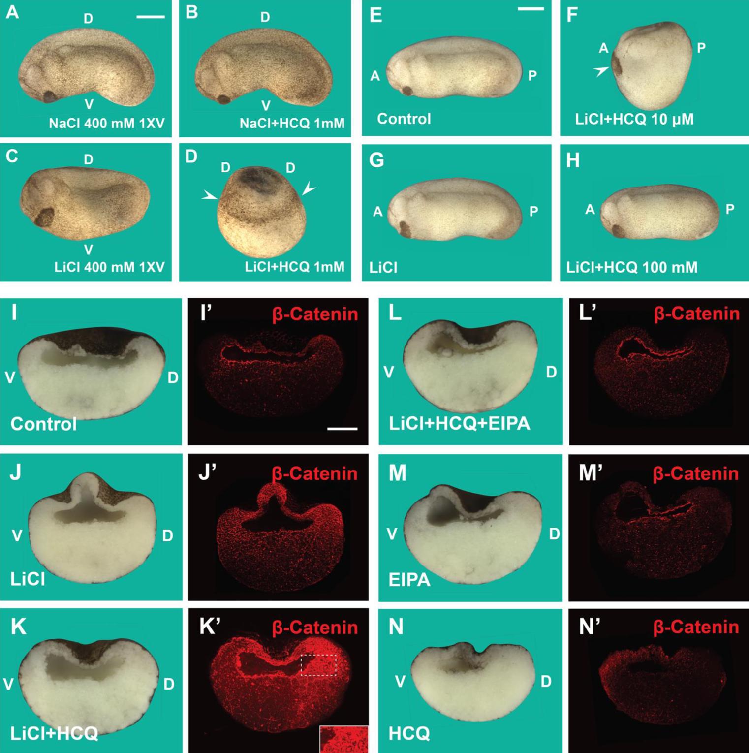 SI Appendix, Fig. S4. LiCl, but not NaCl, cooperated with low-dose HCQ while 100 mM HCQ did not increase dorsalization; β-catenin protein is stabilized by microinjection of LiCl, potentiated by co- injection of HCQ, and blocked by EIPA at blastula stage. (A) Embryo injected with 400 mM NaCl (4nl once ventrally) has normal development at stage 24. (B) NaCl does not cooperate with HCQ, providing a specificity control. (C) Embryo weakly dorsalized by LiCl alone (4 nl at 300 mM ventrally). (D) LiCl plus HCQ (1 mM) showing a radial dorsalized phenotype with circular cement gland. (E and F) 10 mM LiCl cooperates with HCQ; note that the Xenopus embryo has a wider concentration range (1-10 mM) for the HCQ effect in comparison to cultured mammalian cells. (G and H) At a high concentration of (100 mM) HCQ does not cooperate with LiCl, as is the case in cultured cells. (I and Iâ) Endogenous β- catenin was almost undetectable in control embryos at blastula stage. (J and Jâ) β-catenin protein was stabilized by injection of the GSK3 inhibitor LiCl. (K and Kâ) Dorsal β-catenin was greatly enhanced by co-injection of HCQ and LiCl; inset shows both nuclear and cell membrane localization. (L and Lâ) The macropinocytosis inhibitor EIPA (1 mM) blocked the effects of LiCl plus HCQ. (M-Nâ) EIPA or HCQ alone did not affect β-catenin protein staining. These results confirm that LiCl plus HCQ are strongly dorsalizing and that Na+/H+ exchanger inhibition blocks this effect. Arrowheads indicate cement gland, D, dorsal; V, ventral; A, anterior; P, posterior. Numbers of embryos analyzed were as follows A=52; B=58; C=60; D=78; E=51; F=28; G=29; H=45. In I-Nâ about n=30 half-embryos were analysed per condition. Scale bar 500 ïm. |