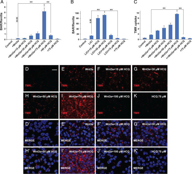 Fig. 2. Wnt3a, LiCl transcriptional activity, and macropinocytosis are potentiated by low-dose HCQ. All assays were performed in HEK293-BR cells that contain stably integrated BAR and Renilla reporter genes. (A) Wnt3a treatment for 18 h was strongly potentiated by 75 µM HCQ and inhibited by higher concentrations. (B) HCQ increased LiCl-induced β-catenin signaling but at lower concentrations. (C) Macropinocytosis of TMR-dextran 70 kDa was stimulated by low doses of HCQ and inhibited at high levels. Note that, in all cases, HCQ was without effect in the absence of Wnt or LiCl treatment. Experiments represent biological triplicates. Error bars denote SEM (n ≥ 3) (**P < 0.01). (D and D’) HEK-293T cells have very low levels of macropinocytosis after 1 h of incubation with a macropinocytosis marker TMR-dextran 70 kDa. (E and E’) Addition of Wnt3a (100 ng/mL) increases macropinocytosis. (F–I’’) The addition of HCQ potentiates Wnt-stimulated macropinocytosis, particularly at 75 µM HCQ. (G and G’’) At higher concentrations (100 µM), HCQ inhibits macropinocytosis. (K and K’’) HCQ alone (75 µM) has no effect on macropinocytosis. Wnt3a induced micropinocytosis, and this is greatly potentiated by low-dose HCQ and inhibited by high dose HCQ, while HCQ alone has no effect on macropinocytosis The results of a similar experiment to that shown here were quantified by spectrophotometry in C. (Scale bars, 10 μm.) See also SI Appendix, Figs. S2 and S3. |